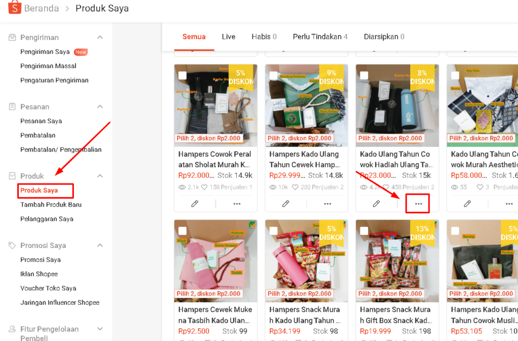 Biasanya setiap toko memiliki 4 kuota fitur naikkan produk. Anda bisa menggunakan fitur ini dengan sangat mudah. Anda tinggal masuk ke seller center, pilih Produk Saya kemudian pilih Lainnya atau Titik Tiga, lalu klik Naikkan Produk.