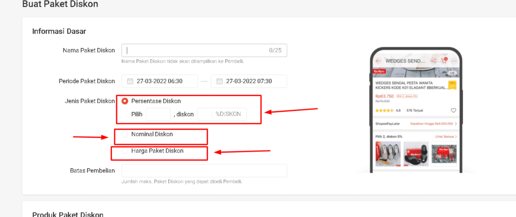 Ada tiga jenis paket diskon yang bisa anda gunakan yaitu adalah persentase diskon, nominal diskon, harga paket diskon.