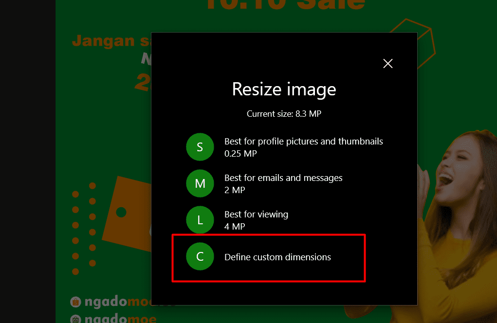 3. Selanjutnya akan ditampilkan beberapa pilihan kompres, untuk mendapatkan hasil yang maksimal Anda bisa memilih Define Custom Dimensions. Ini berguna untuk mengatur ukuran gambar secara manual sesuai dengan keinginan.