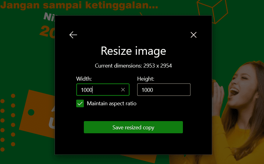 4. Selanjutnya Anda bisa bebas mengatur ukuran lebar dan tinggi gambar. Jika ingin membuat ukuran gambar menjadi lebih kecil maka pastikan untuk memilih lebar dan tinggi lebih kecil dari ukuran gambar sebelumnya.
