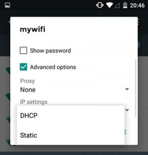 Periksa Opsi Lanjutan, lalu ubah pengaturan IP menjadi “Statis”
