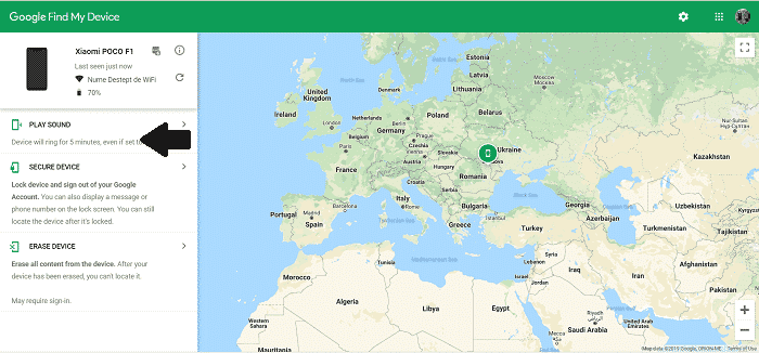 Jika Anda ingin perangkat Anda berdering dengan volume penuh , pilih opsi Dering. Ini adalah cara yang bagus untuk menemukan perangkat Anda jika Anda tidak dapat menemukannya di dalam rumah Anda. Klik tombol Putar Suara di sisi kiri layar.