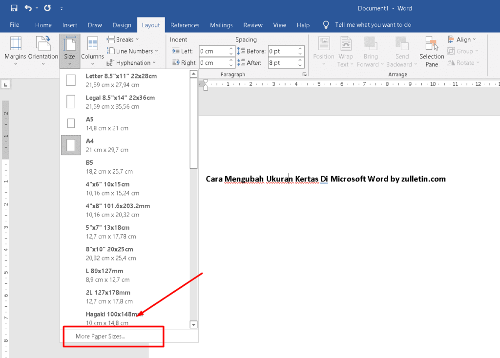 4. Setelah menu size anda klik nantinya akan muncul beberapa ukuran default yang disediakan oleh microsoft word.